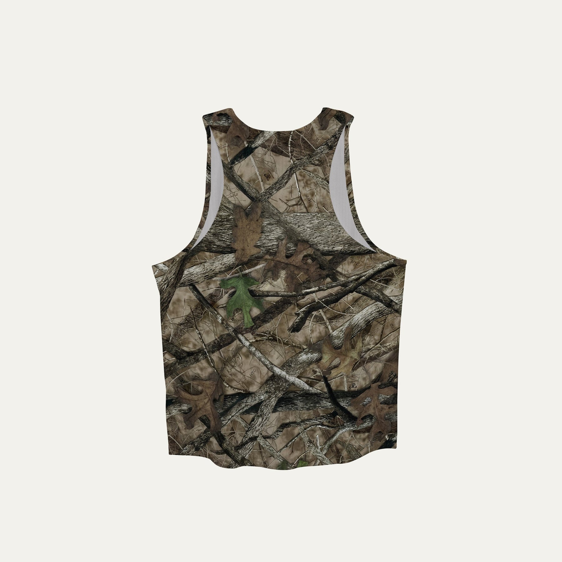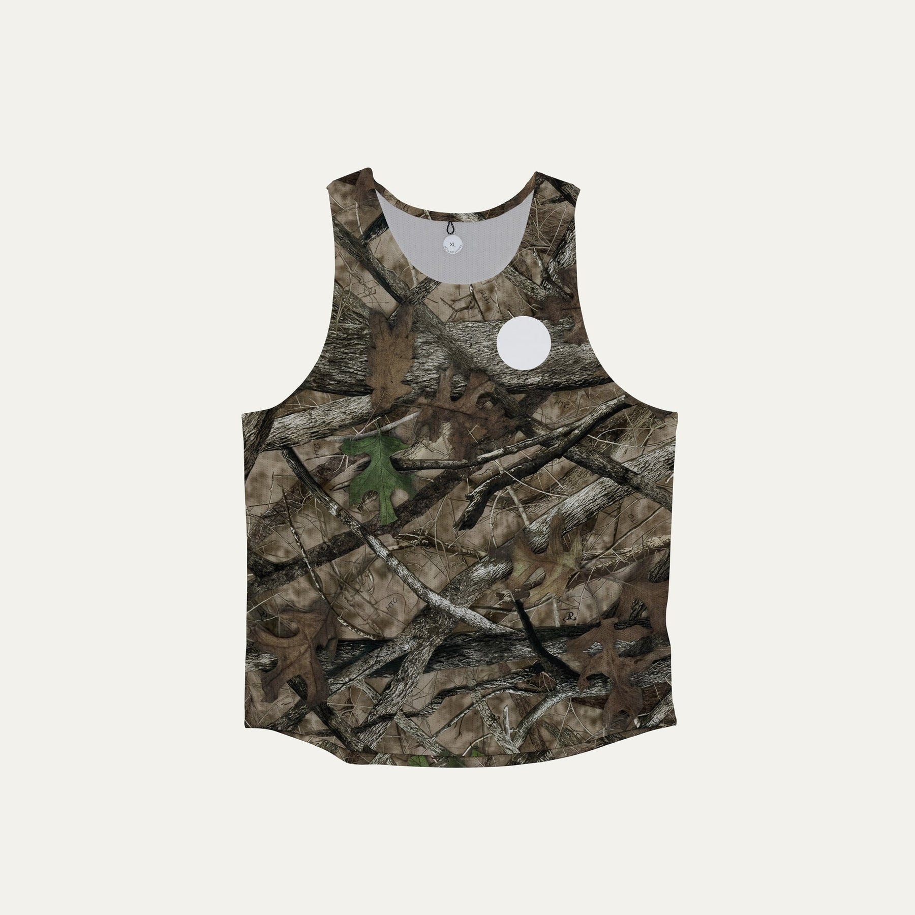 Participation Real Tree singlet, breathable mesh, camo forest print, white circle logo on chest.