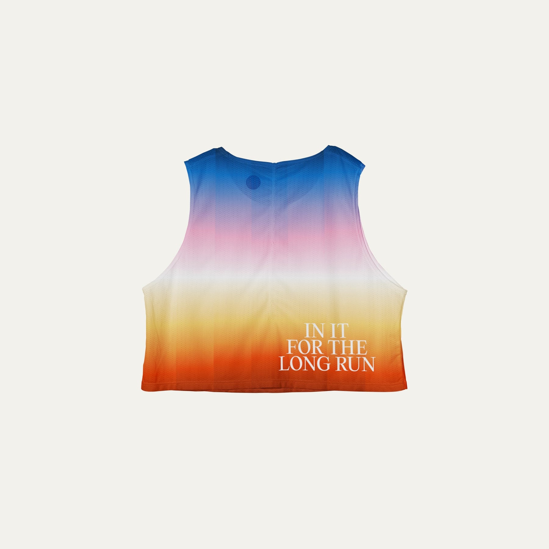 Cropped running singlet from Participation with In It for the Long Run graphic, lightweight polyester fabric for everyday training, photographed in a neutral studio setting.